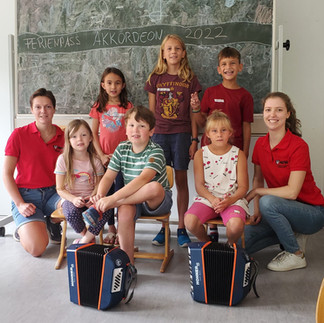 Bereits am ersten Tag konnten die ersten Töne gespielt werden und auch das erste Lied ließ nicht lange auf sich warten. Die Begeisterung bei den Teilnehmer*innen war groß. Der Akkordeonunterricht fand in zwei Kleingruppen mit Lotti Kaspar statt, während die jeweils andere Gruppe mit Carolin Schauer Schritt für Schritt die Noten im sogenannten „Fünf-Ton-Raum“ kennenlernten und spielerisch lesen übten. Gemeinsam wurde zudem das Rhythmusgefühl mithilfe verschiedenster Percussion-Instrumente geschult. Ein Highlight war dabei das Vor- und Nachspielen verschiedener Rhythmen auf Trommeln aus Eimern. Besonders stolz waren alle Kinder, als sie der anderen Gruppe am Ende der Woche ihre eingeübten Stücke auf dem Akkordeon präsentieren konnten. Damit ging eine sehr musikalische und ereignisreiche Woche zu Ende, in der wir gemeinsam viel Spaß hatten.