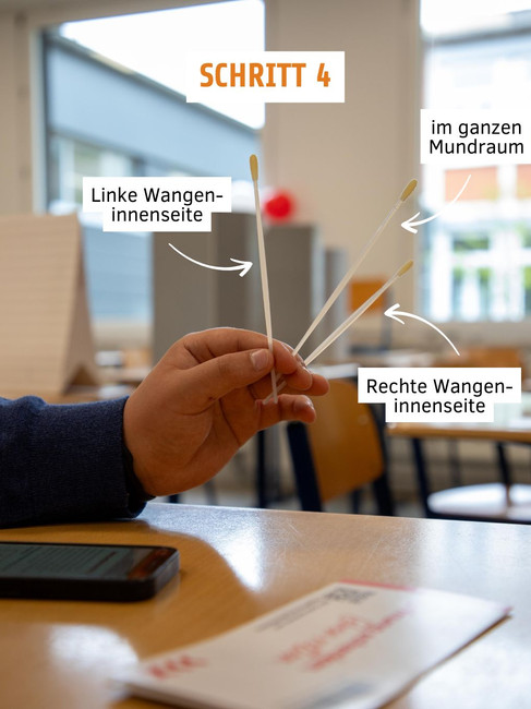 „Wir bewirken etwas mit dem, was wir hier machen. Das ist spannend“, sagt Schülerin Amara Badjie. Ein Klassenzimmer wurde zum Typisierungsraum umfunktioniert. Auf den Tischen kleben QR-Codes, wo man sich registrieren kann. Anschließend wird mit drei Wattestäbchen eine Speichelprobe genommen – jeweils aus der linken und rechten Wangeninnenseite sowie dem gesamten Mundraum. Die Proben werden danach in einem Umschlag versiegelt und zur DKMS gesendet.