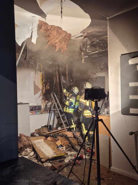 Sofort gingen mehrere Atemschutztrupps zur Brandbekämpfung ins Gebäude vor. Es brannte nicht, wie zuerst gemeldet im Keller des Hauses, sondern im Erdgeschoss des Geschäftsbereiches. Ausstellungsgegenstände sowie Regale und Schränke hatten aus bislang ungeklärter Ursache Feuer gefangen und das Feuer hatte sich bereits in die Zwischendecke und hinter Leichtbauwände gefressen.