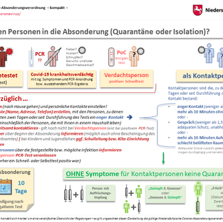 HANNOVER. Nach der heutigen Landespressekonferenz fasst das Gesundheitsministerium die drei wesentlichen Änderungen an der Absonderungs-Verordnung, die gemeinsam mit der geänderten Corona-Verordnung (CELLEHEUTE berichtete) in Kraft getreten sind, noch einmal zusammen und hat die Grafiken (s. unten) dazu entsprechend angepasst.