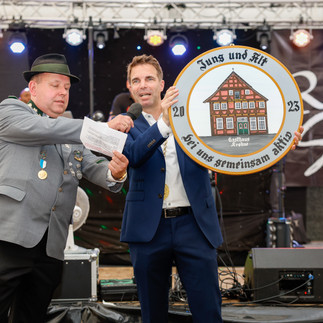 Als treffsicher erwies sich auch Oberbürgermeister Jörg Nigge: Beim Fassbieranstich im Festzelt trieb er den Zapfhahn mit zwei Schlägen ins Fass. Als Parole des diesjährigen Schützenfestes verkündete er den Slogan „Jung und Alt bei uns gemeinsam aktiv“, was vom großen Gemeinsinn der Schützen zeuge, so Nigge.