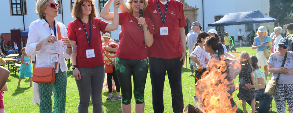 Radsportlerin Marlene Timme, Tischtennisspieler Detlef Steitzer und Bundestrainerin Kerstin Sauerwald-Weiß entzündeten das Feuer nach der Begrüßung von Celles Sportdezernentin Susanne McDowell vor dem Celler Schloss, mit dabei die Präsidentin der Special Olympics Niedersachsen Andrea Liebich und Projektleiter Matthias Peters.