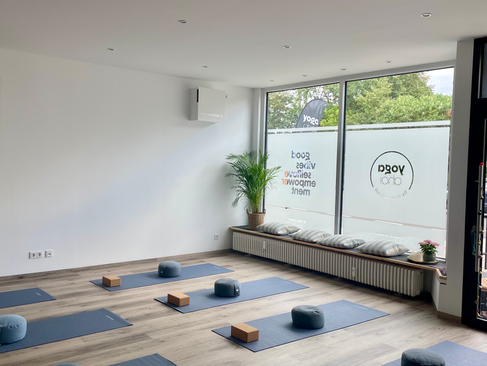 Im neuen Yoga-Raum finden bis zu 15 Kursteilnehmer Platz. Auf der Fensterbank laden Kissen zum Sitzen ein, an einer Wand steht der Schriftzug "You matter. Always." In einem kleinen Umkleideraum türmen sich die verschiedensten Hilfsmittel: Meditationskissen zum Draufsetzen, Yogaklötze, Decken und Gurte. Je nach Yoga-Art kommen andere Utensilien zum Einsatz. "Ich unterrichte modernes Yoga ohne Kling-Klang-Klong und Chichi", betont Nina Eickhoff. "Hier geht es nicht um akrobatische Höchstleistungen, sondern dass man vom Kopf wieder in den Körper kommt. Yoga für den Alltag."